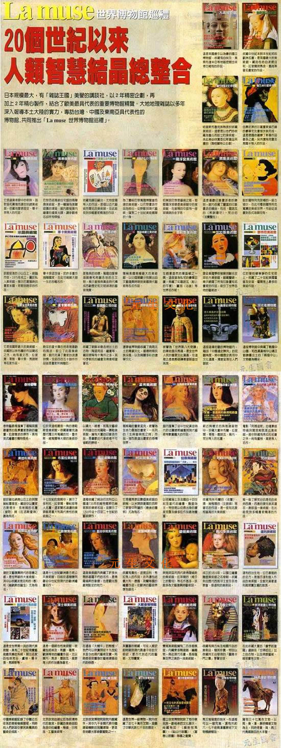 2日本規模最大,有「雜誌王國」美譽的講談社,以2年精密企劃,再加上2年精心製作,結合了歐美最具代表的重要博物館精覽。大地地理雜誌以多年深入報導本土大陸的實力,專訪台灣、中國及東南亞具代表性的博物館,共同推出「La muse 世界博物館巡禮」。