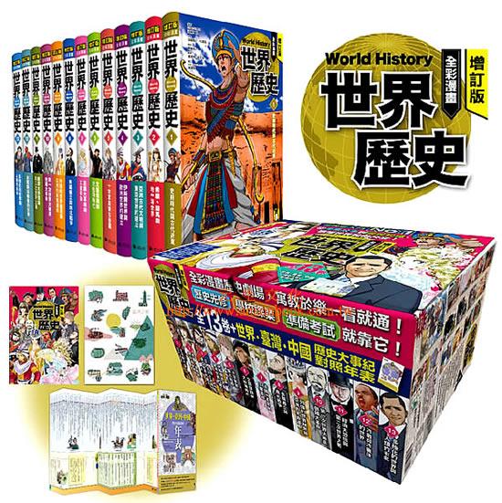 2《增訂版全彩漫畫世界歷史》(全13卷),依編年史分冊。除了每一卷書籍內容皆分為「漫畫故事」與「歷史知識」兩個部分,更在每一卷進入漫畫故事前,特別設計「歷史綜合分析」和「主要登場人物」兩個單元。